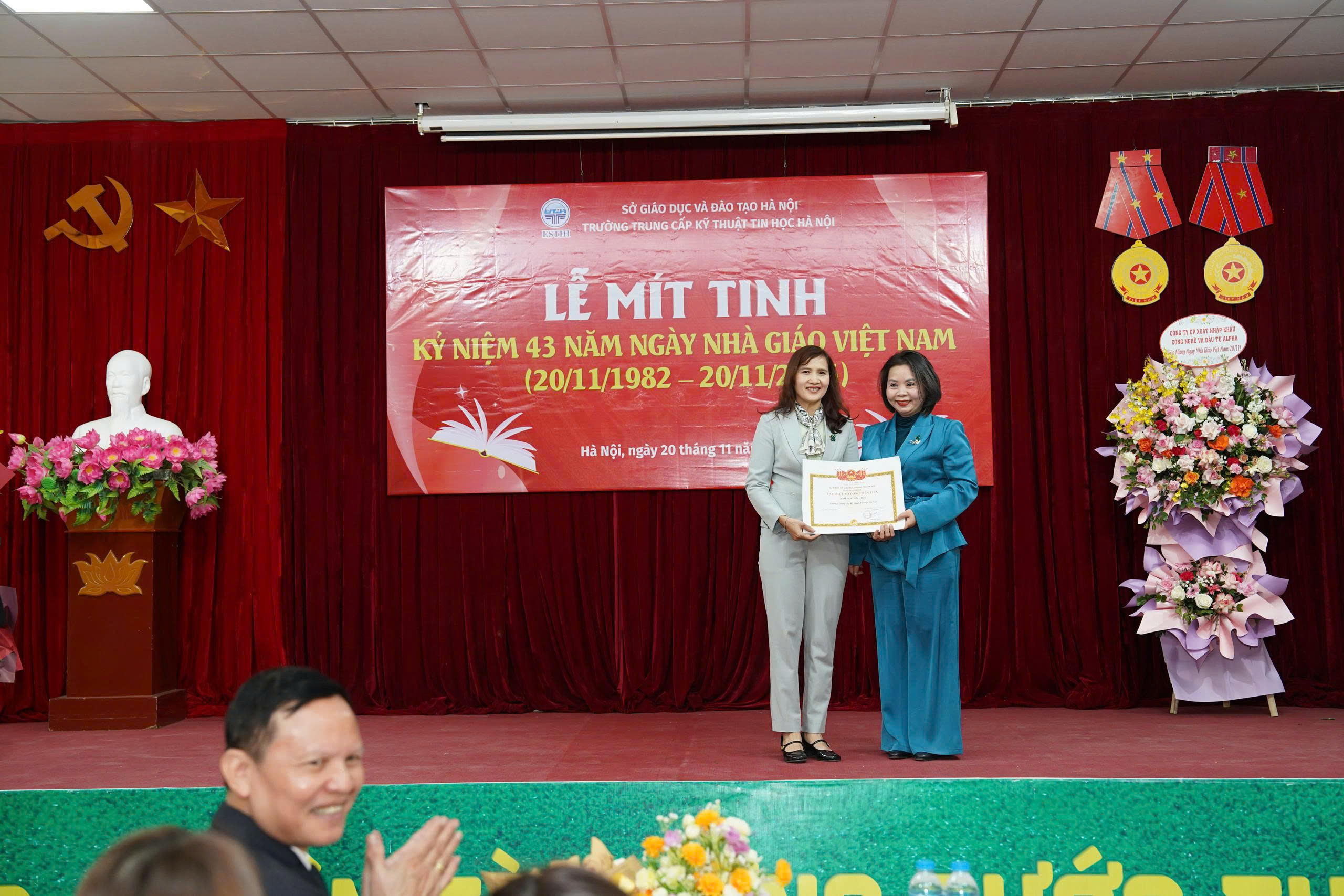Bà Lê Thị Thái Hà, chuyên viên phòng GDTX – GDNN và Đại học đã thay mặt Sở Giáo dục và Đào tạo Hà Nội trao tặng Danh hiệu Tập thể lao động tiên tiến – Năm học 2024-2025 cho nhà trường.