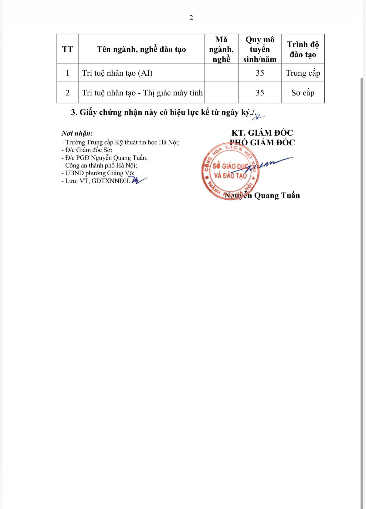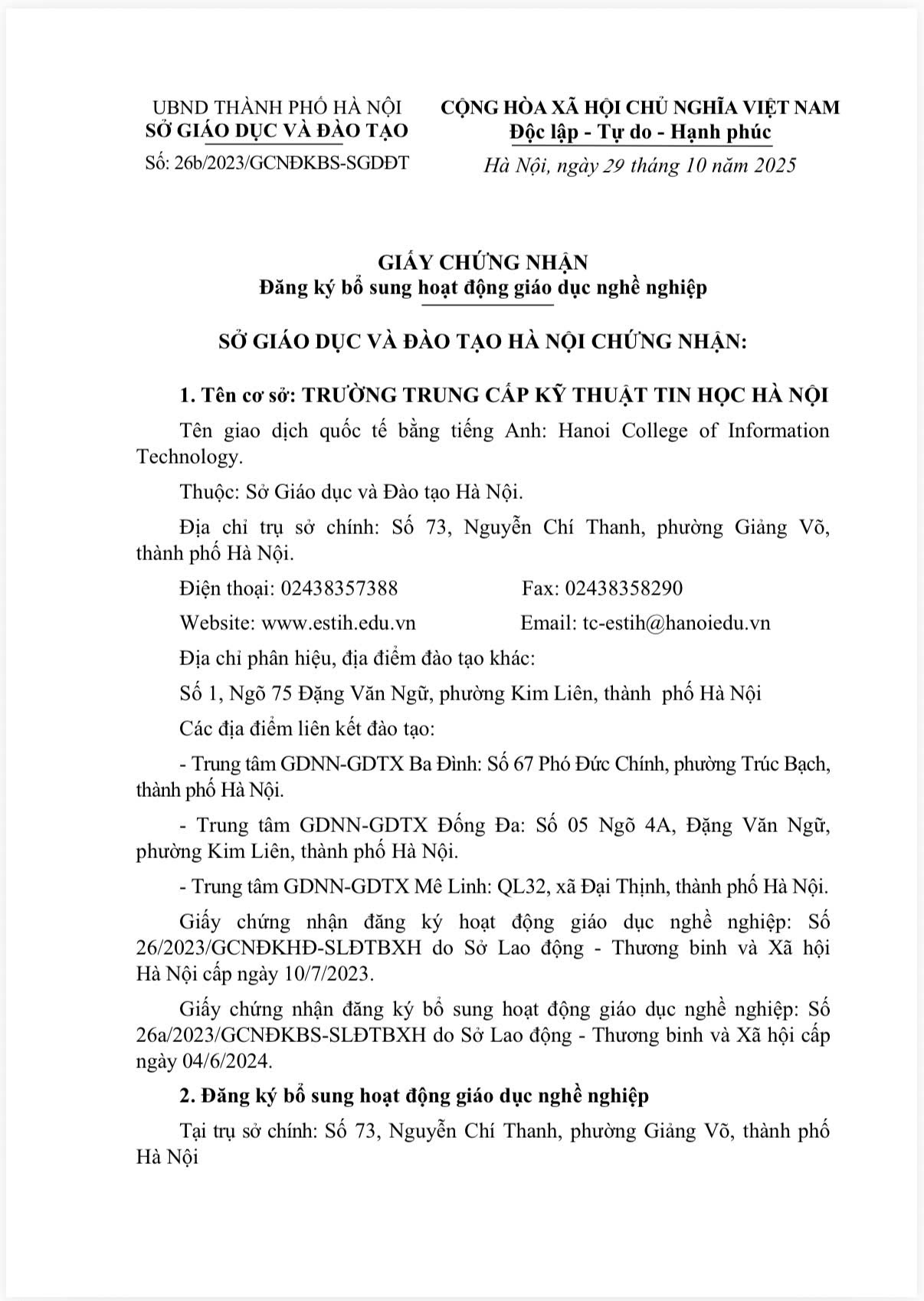 Ngày 29 tháng 10 năm 2025, trường TC Kỹ thuật tin học Hà Nội đã được Sở Giáo dục và Đào tạo Hà Nội cấp Giấy chứng nhận đăng ký bổ sung hoạt động giáo dục nghề nghiệp với 02 ngành đào tạo: